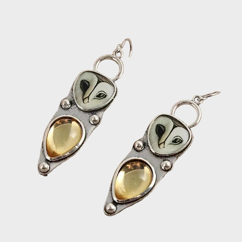Descubre el encanto del bosque nocturno con estos únicos pendientes hechos a mano que combinan el arte con la naturaleza. Cada pieza cuenta con un rostro de búho meticulosamente tallado que se asienta sobre una brillante piedra en forma de lágrima en un tono miel, evocando la calidez del ámbar. Con un acabado en plata oxidada que aporta una sensación vintage de misterio, estos pendientes no son solo accesorios, sino pequeñas obras de arte que añaden un toque de sabiduría y elegancia a cada uno de tus looks.