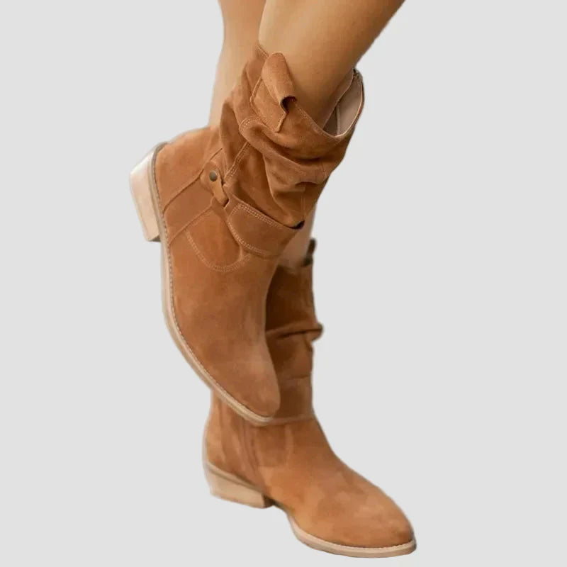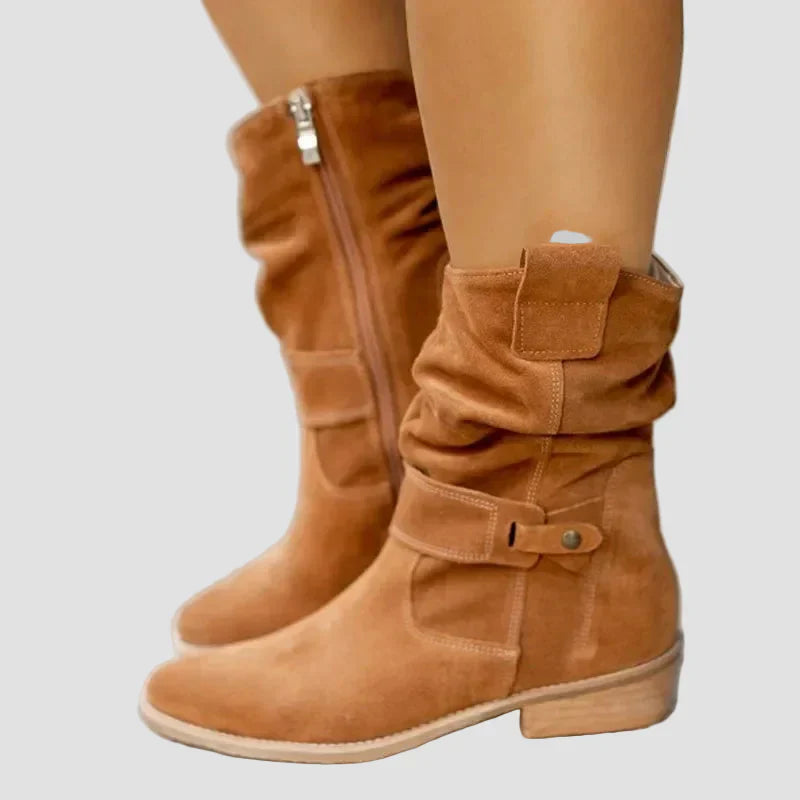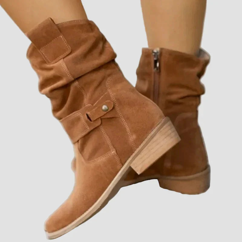 Encanto Rústico y Elegante: El suave ante y el diseño slouchy de media altura con hebilla lateral ofrecen una estética western discreta, ideal para looks relajados.