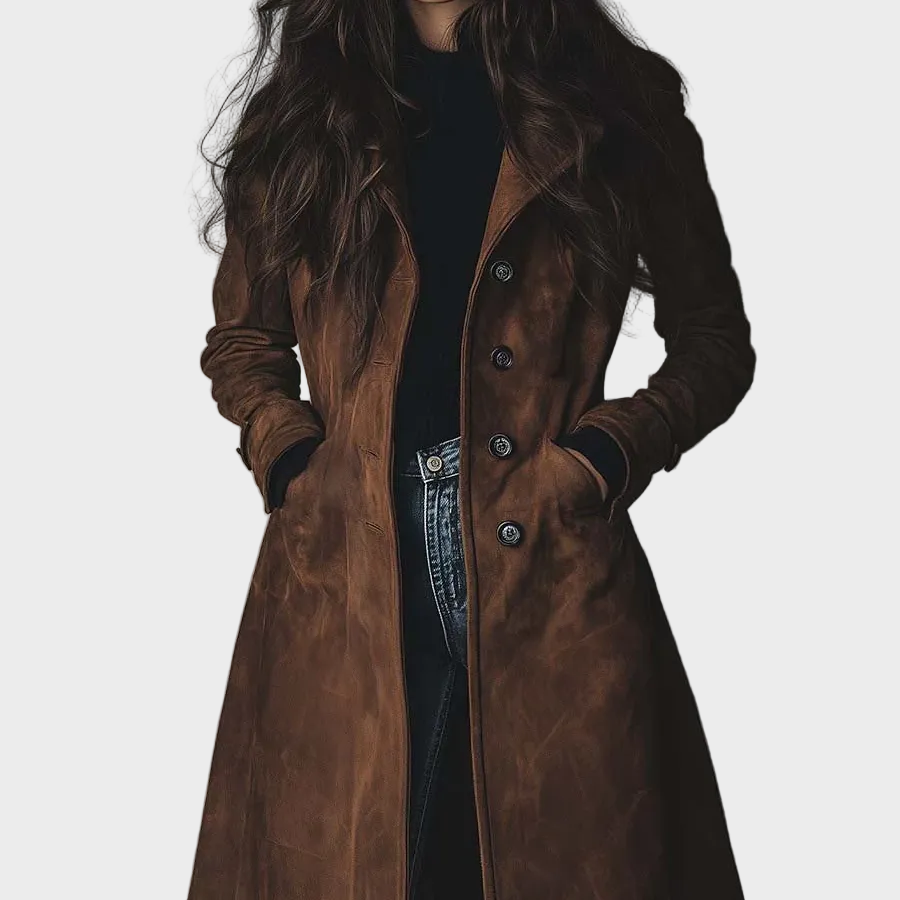 El Myrto es un abrigo de ante que combina un corte clásico. El diseño simple y elegante hace que el abrigo se ajuste perfectamente a la silueta y se adapte fácilmente tanto a conjuntos cotidianos.