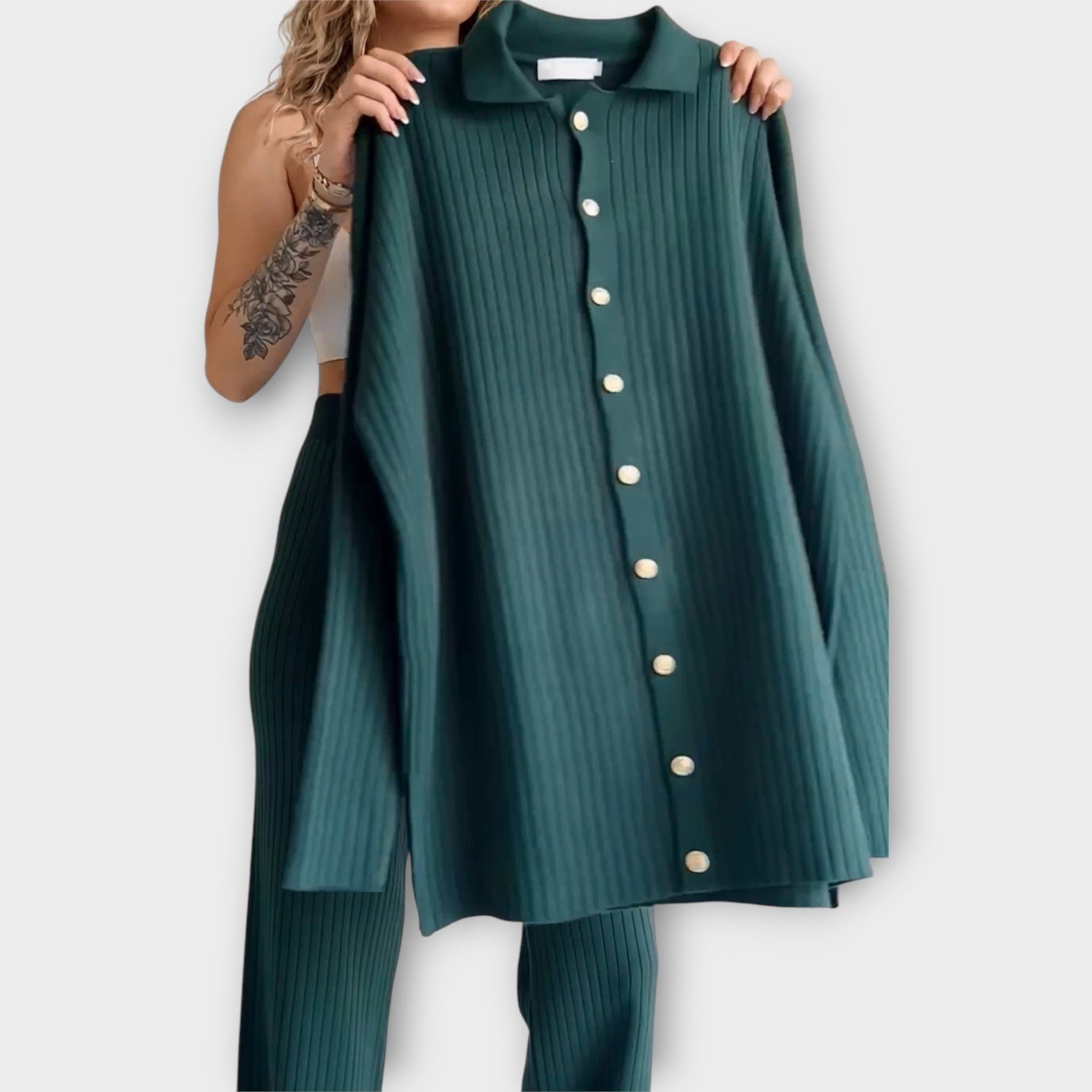 Un conjunto elegante que se adapta fácilmente a cualquier estilo, otorgando un toque refinado a cada apariencia. Su diseño versátil lo hace ideal para todas las ocasiones, desde casual hasta más formales, combinando practicidad y elegancia atemporal. Su textura suave asegura comodidad, mientras que su ajuste relajado y estética minimalista irradian sofisticación.