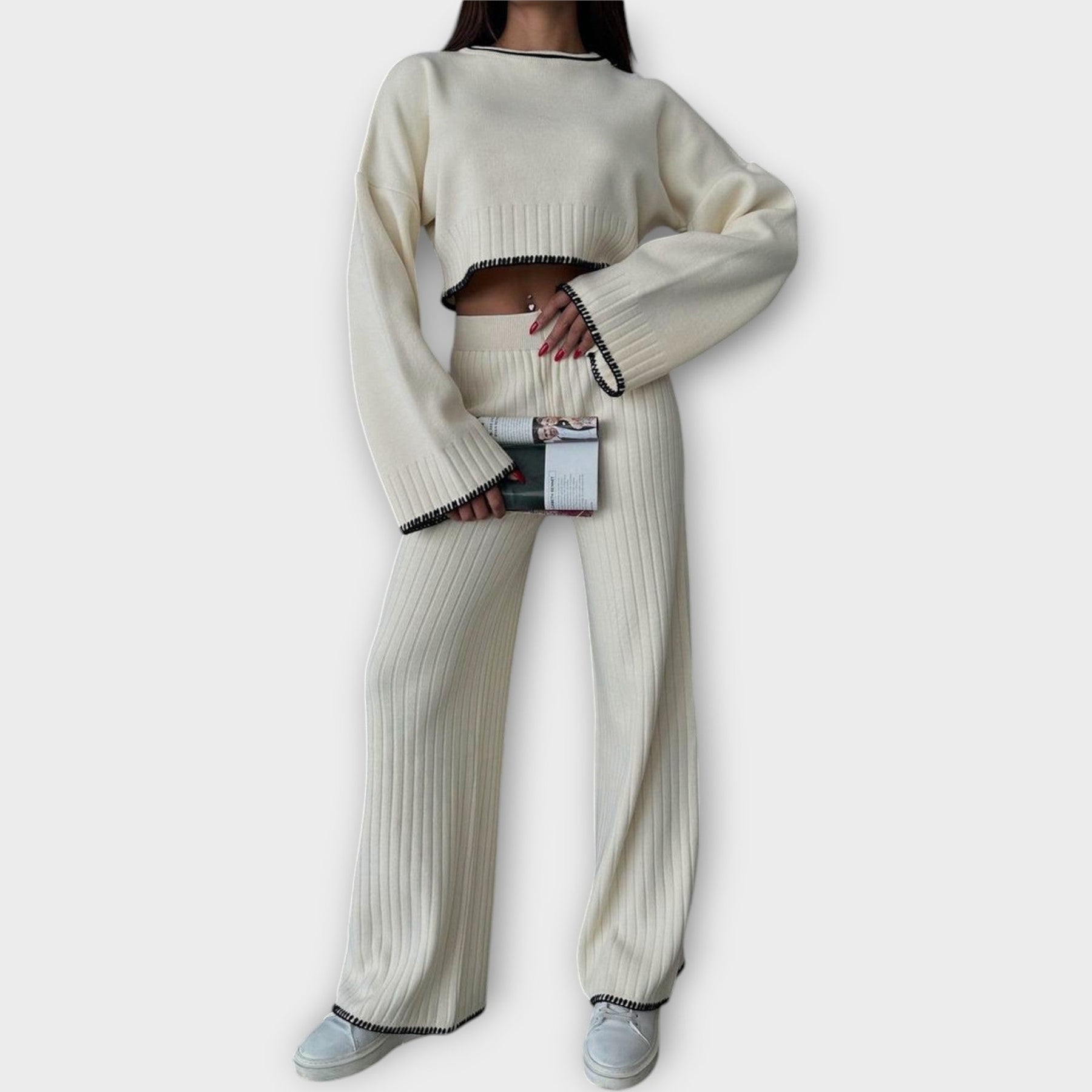 Conjunto de Punto con Blusa Cropped y Detalles Refinados