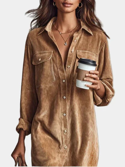 Un cómodo y elegante vestido midi de suave pana, con un corte relajado y un carácter atemporal. Cuenta con dos bolsillos en el pecho y un cierre clásico con botones, añadiendo un toque retro discreto. Ideal para uso diario, desde la mañana hasta la tarde.