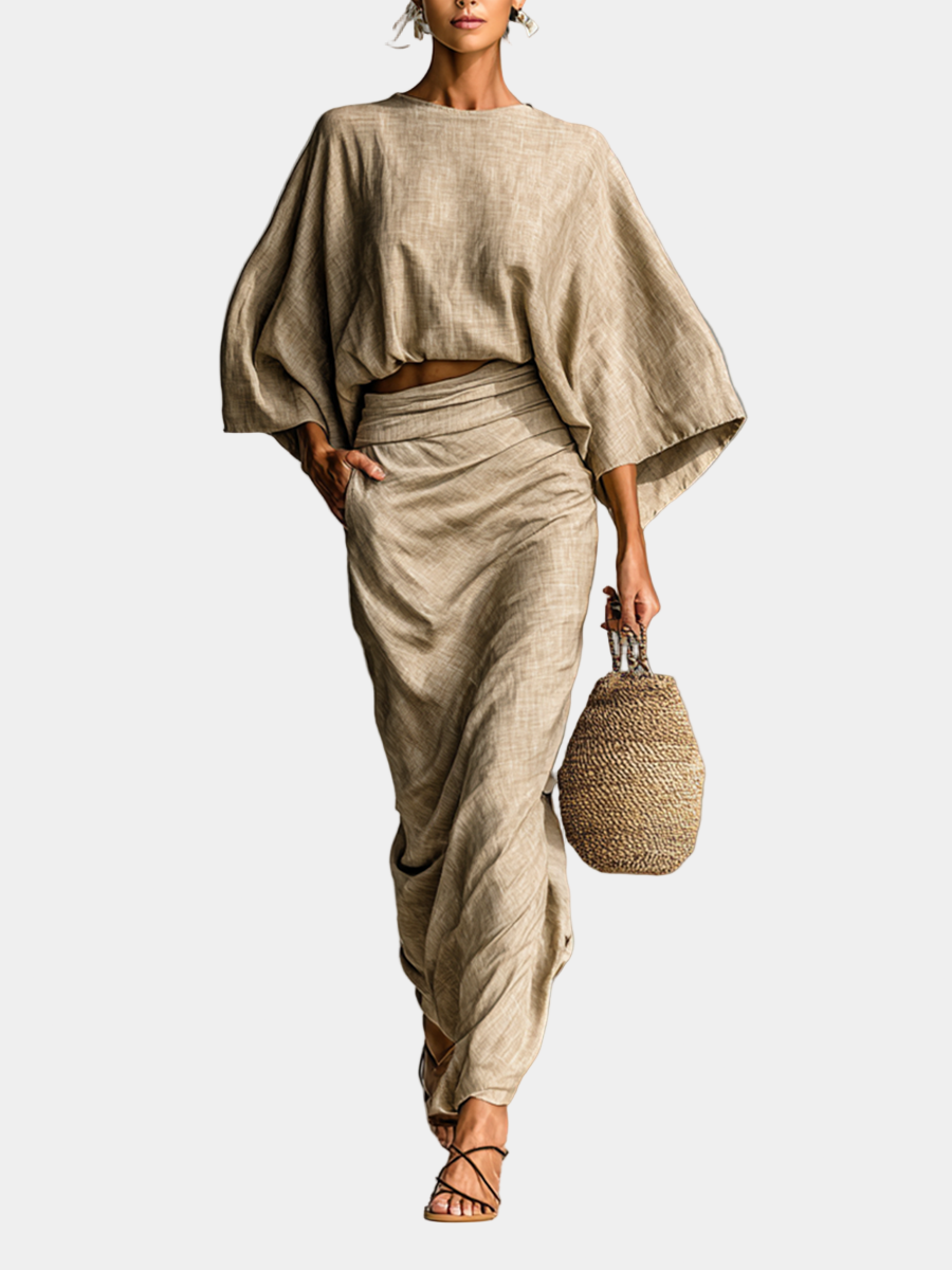 Este diseño de dos piezas cuenta con una blusa ancha de manga larga estilo murciélago y una falda larga con línea fluida, logrando el equilibrio perfecto entre comodidad y elegancia.